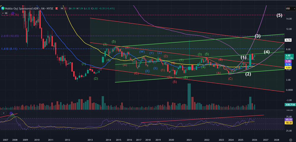 Lyhyessä kuvassa eilen testattiin breakout noin 6,78 USD tason päälle. Noin 7 USD tasolla on vastus ja tuolta lähti jo päivää aiemmin iltaa kohden myyntiaalto liikkeelle. Voi olla että myyntien takana olivat voimakas USD liike sekä lähestyvä tulos. Myös ennen edellistä Q3/2025 tulosta nähtiin pari voimakasta myyntipäivää. Hyvänä puolena eilen nähtiin tason puolustus, ja kurssi nousi voimakkaasti iltaa kohden avauksesta. 6,78-7,00 USD taso on nyt oleellinen vedenjakaja. Aaltoteorian mukaan aallon vaiheet 1-2 olisivat takana ja osake olisi nyt nousevassa aallossa numero 3. RSI on neutraalilla tasolla.