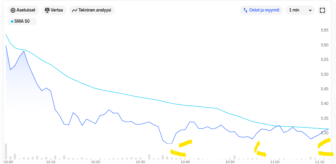 Teknisestä kuvasta sen verran, että myönteinen skenaario ei näyttänyt ainakaan vielä toteutuvan. Edeltävä pohja oli @ 5,404 € (päivätason LL). Tämän jälkeen tehtiin uusi korkeampi huippu. Kestääkö tuo aiempi pohja vai ei? Noniis nyt samalla vahvistui että syvemmälle mennään, eli tuosta osake sai nyt lisävauhtia laskulle.
