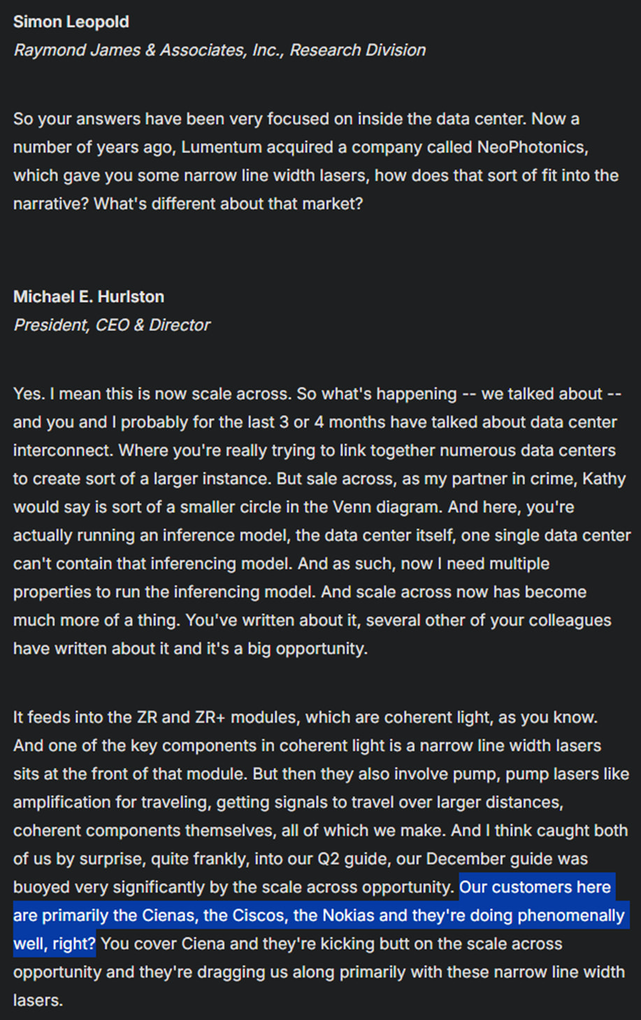 Tässä Lumentumin toimitusjohtaja käytännössä vahvistaa että Nokia on niiden asiakas, ja minkäs muun osalta se olisi kuin InP -laserien. Cisco ja Ciena eivät siis itse tee niitä ollenkaan, eli joutuvat turvautumaan muihin. Nokia tekee siis itse (Infineran tehtaat) ja pian tämä kapasiteetti on 25x nykyiseen nähden.