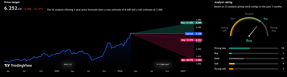 Tavoitehintojen keskiarvo on ollut viime aikoina nousussa, markkinan mukana. Ennen Nvidia -uutista keskiarvo oli 5,15 €, joulukuussa puolestaan 5,82 € ja nyt ihan viimeisen viikon aikana ollaan saavutettu uusi targethuippu.