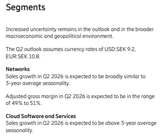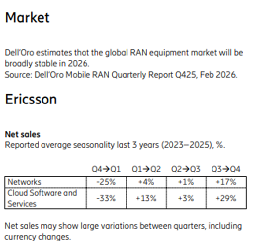 • Markkinatilanne: Ericsson odottaa RAN-markkinan (verkkomarkkinan) pysyvän tasaisena (“flattish”) vuonna 2026.