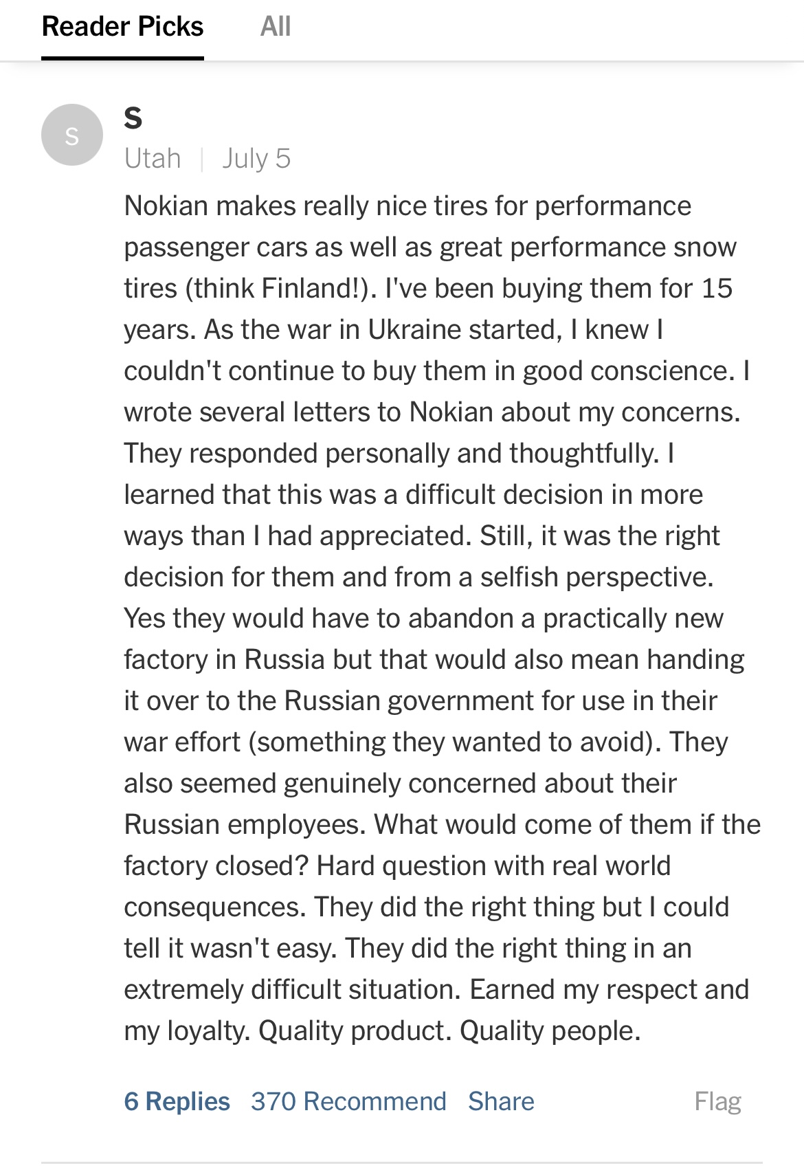 Eli tulevat ja nykyiset asiakkaat keskustelevat itse kuinka paljon arvostavat Nokian Renkaiden strategista liikettä, tuotteita ja nostavat esille (jenkki)organisaatioita, joilla ei ole ollut uskallusta tai halua lähteä pois Venäjältä.
