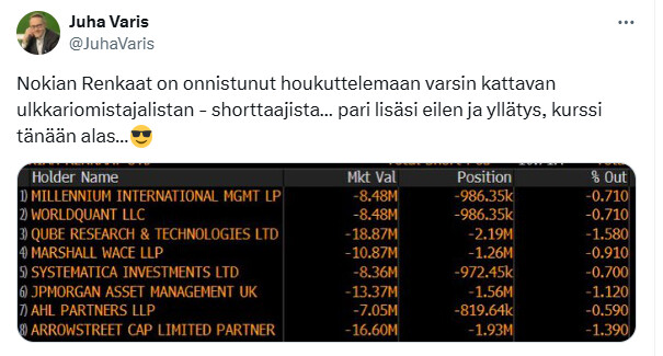 Tällä hetkellä varmaan paras intuitio osakkeesta Helsingin pörssissä ja ylipäätään Nokian Renkaiden menestyksestä tulevaisuudessa, kysymys kuuluukin miten nopeaan noustaan, itse odotan ja veikkaan ennusteita nopeampaa käännettä mutta se on asia joka pitää jokaisen itse harkita ja miettiä sijoittaako ja uskooko Renkaiden menestykseen.