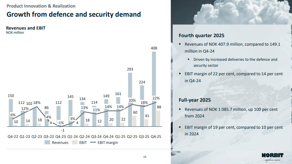 - Aivan tajuton kvartaali puolustussektorin vetämänä. Tämä kaksiteräinen miekka: Onko vain hetkellistä huumaa, ja PIR palaa takaisin matalakatteiseen mörnintään, vai tuleeko tästä uusi normaali? Jos tulisi, saisi Norbit tästä historiallisesti heikommastakin segmentistä varsinaisen tehojyrän, jolloin myös yhtiön tulevaisuus kirkastuu huomattavasti (kun kaikilta segmenteiltä voidaan odottaa hyvää menekkiä).