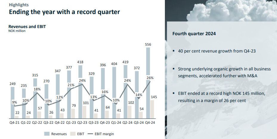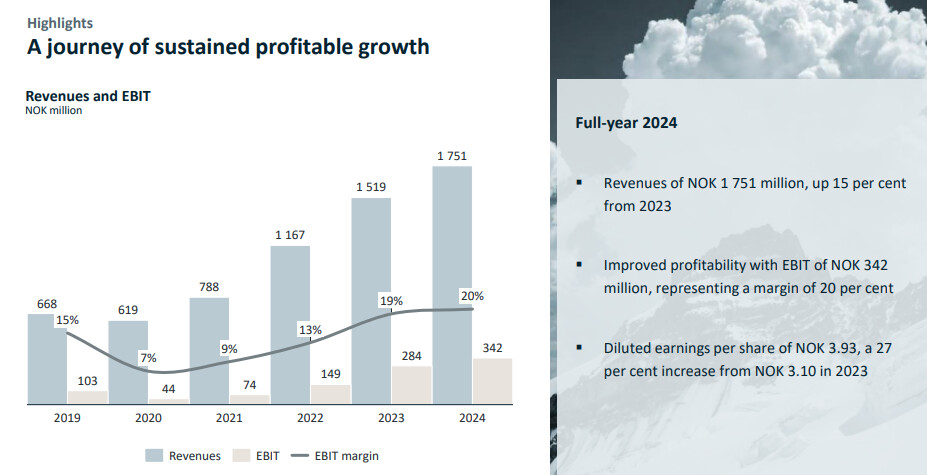 The fourth quarter also set a new record, with revenues reaching NOK 556.1 million - an increase of 40 per cent compared to the same period in 2023. The EBIT result for the quarter was NOK 145.0 million, representing a margin of 26 per cent.