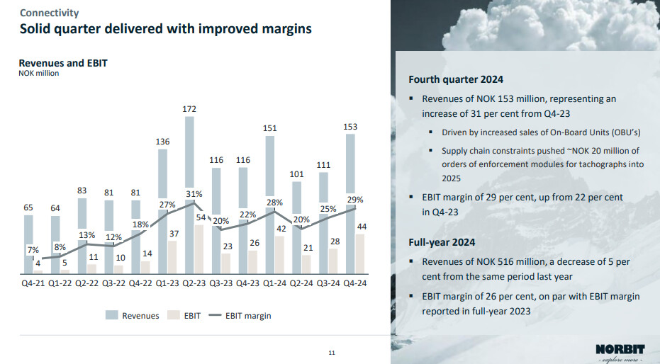 - The Connectivity segment reported revenues of NOK 111.0 million, a decrease of 4 per cent, and an EBIT margin of 25 per cent.