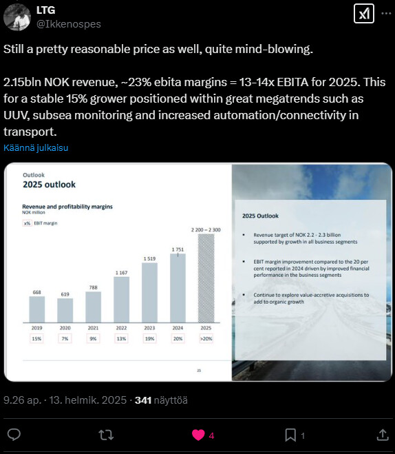 Norbit taas kerran toisti keskipitkän aikavälin ohjeistuksensa. Vuonna 2025 tavoitellaan siis edelleen kovaa kasvua kaikissa segmenteissä, ja ohjeistettu haarukka on 2.2 - 2.3 mrd NOK liikevaihtoa yli 20 ebit-%. Tavoitteet ovat mielestäni vähintäänkin kunnianhimoiset, mutta edelleenkään minulla ei ole syytä epäillä johdon asettamia tavoitteita: track record puhuu puolestaan. Konffapuhelussa tuotiin hyvin esiin myös se, että jatkuva M&A etsintä on käynnissä. Nyt näyttäisi siltä, että Innomar hankinta on osunut todella hyvin nappiin.