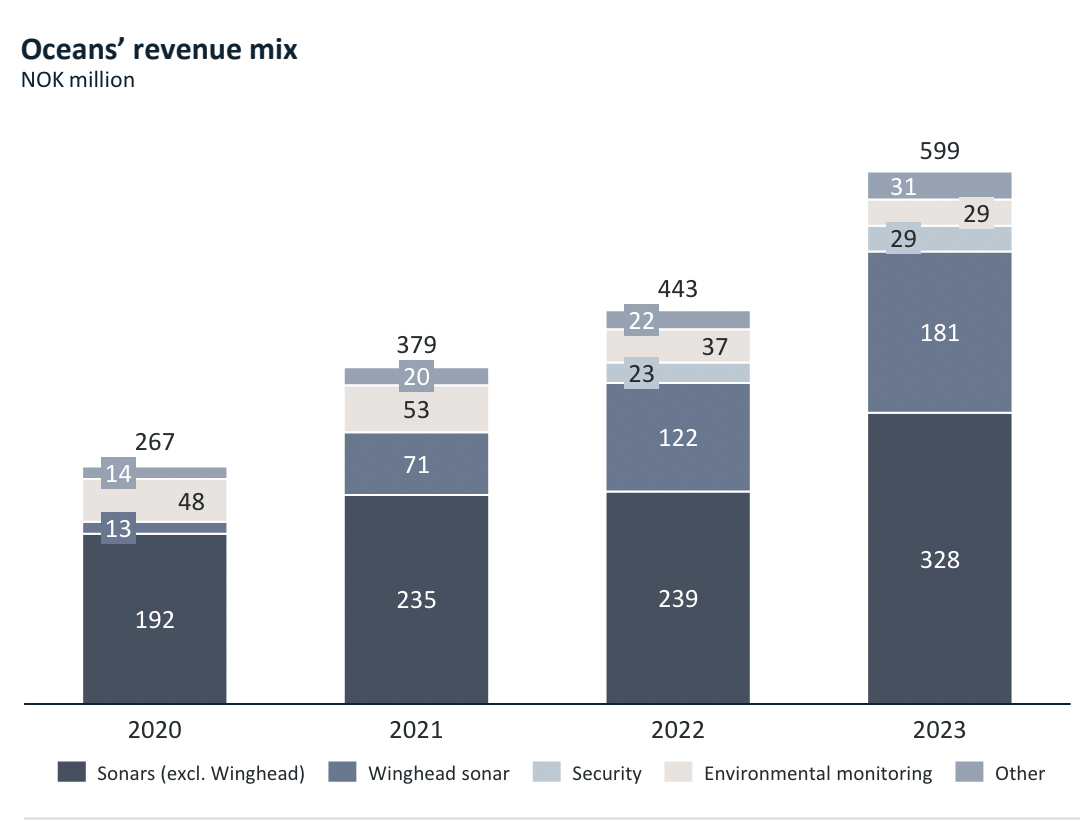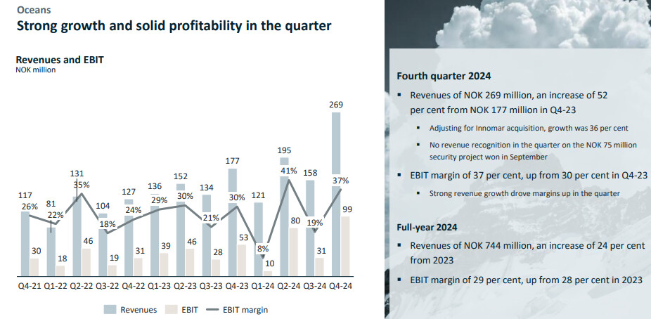 The Oceans segment achieved all-time high revenues of NOK 269.0 million, a 52 per cent increase from Q4 2023, with an EBIT margin of 37 per cent.