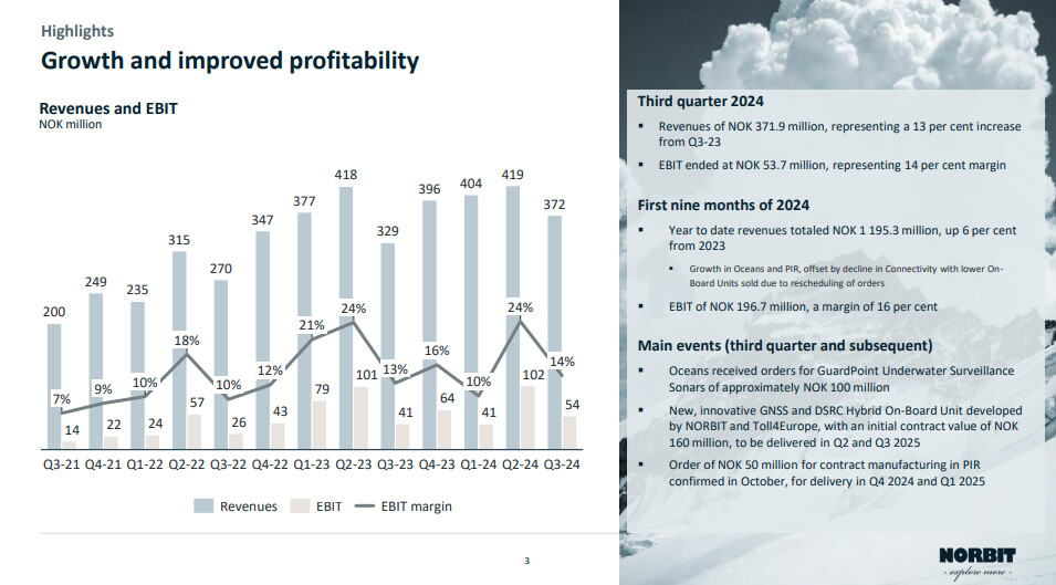 Trondheim, 14 November 2024: NORBIT delivered continued growth in the third quarter, reporting revenues of NOK 371.9 million. The reported EBIT result was NOK 53.7 million and NOK 60.1 million when adjusting for transaction costs relating to the Innomar acquisition.