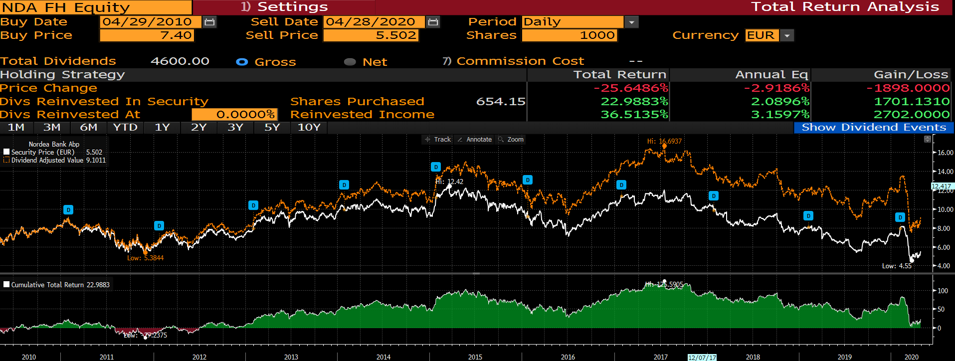 Nyt pitäisi tulla seuraavat viisi vuotta erinomaista suorittamista että tuo menetetty vuosikymmen saataisiin edes osittain kurottua umpeen. Nyt Nordeaan sijoittavan ongelma menneet tuotot ei ole, mutta toimialan ja yhtiön vaikeuksia ja haasteita myös tulevaisuudessa tuo reflektoi.