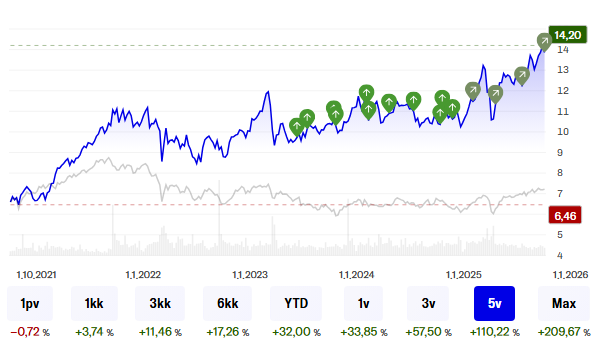 Tavoitehintaviilaukset ylöspäin jatkuvat, norjalainen “finanshus” ABG Sundal Collier nostaa DKK 106,68 → 112,33 (n. 15,04 EUR) ja toistaa osta-suosituksen. (MarketWire/Nordnet tänään klo 8.)