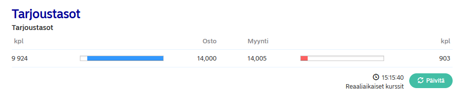 Mitäs mieltä porukka on tästä asiasta? Itse olen tykännyt tehdä osakekauppoja Investorilla. Erityisesti olen tykännyt tästä tarjoustasomittarista joka näyttää määrät ja hinnat reaaliaikaisesti. Verkko- taikka mobiilipankista en tällaista ominaisuutta löytänyt