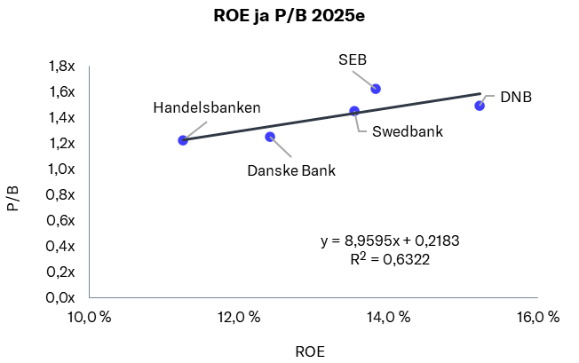 ”Aikaisemmin sovelsimme arvonmäärityksessämme varovaista 12–14 %:n pitkän aikavälin oman pääoman tuotto-odotusta, jonka olemme nyt nostaneet pykälällä 14–15 %:iin ennusteidemme mukaisesti. Lisäksi olemme laskeneet soveltamaamme diskonttokorkoa (10,0 % → 9,5 %), sillä pohjoismaisen pankkisektorin nousseet arvostuskertoimet viittaavat tuottovaatimusten laskeneen koko toimialalla.”