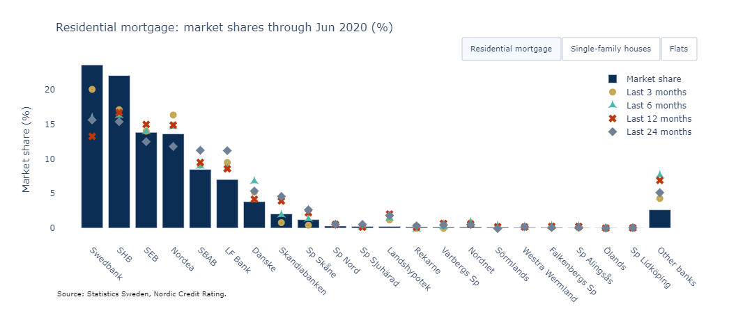 Erittäin hyvä grafiikka! Jos en väärin muista, niin ennen Nordeaa erityisesti SBAB ja Länsförsäkringar Bank (LF Bank) kaappasivat markkinaosuuksia. Nordeassa laitettiin isompaa vaihdetta silmään syksyllä 2018, ja niin kuin grafiikastakin käy ilmi, osuuksia on voitettu takaisin.
