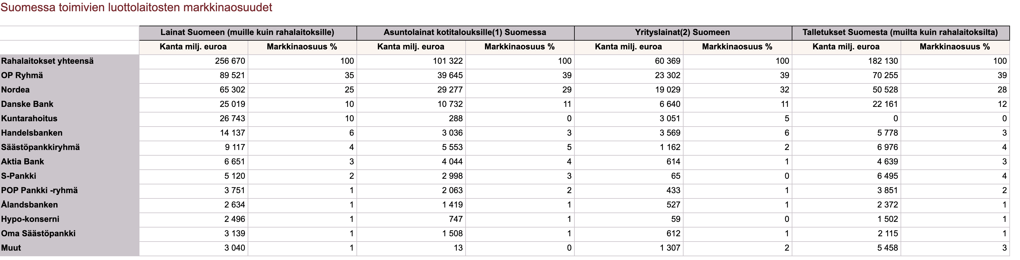 Jos tarkistuspisteitä markkinaosuuksien muutoksiin haluaa hakea, niin Suomen Pankilta tämä tilasto tarjoaa siihen mahdollisuuden. Tämän perusteella Nordean markkinaosuus noin 2 %-yks. ylös vuodenvaihteesta yrityslainoissa. Asuntolainoissa % täysin ennallaan.