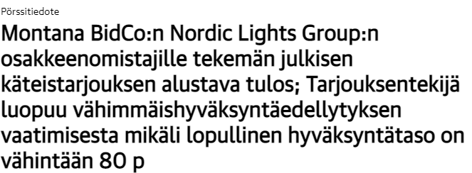“Nordic Lightsin osakkeenomistajat, jotka omistavat yhteensä arviolta 56,5 prosenttia kaikista Nordic Lightsin osakkeista ja äänistä, ovat peruuttamattomasti sitoutuneet hyväksymään Tarjouksen”.