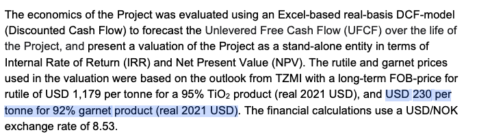 Granaatti ei tosiaankaan ole mitenkään hirveän arvokasta (tyyliin parisataa euroa per tonni), joten sitä pitää toimittaa hirmuisia määriä, että homma toimii. Jos suunnittelivat toimittavansa 35 kt/a rutiilia ja 180 kt/a granaattia, niin sillä saavutetaan 50 % / 50 % liikevaihtomixi, mutta lähes kaikki voitto tulee rutiilista. Kaivos on sataman vieressä ja laivat voivat ajaa hakemaan lastia kuin mäkkärin autokaistalta, joten yllättävän halvalla saa rahtia kuljetettua verrattuna sisämaassa sijaitsevaan kaivokseen.