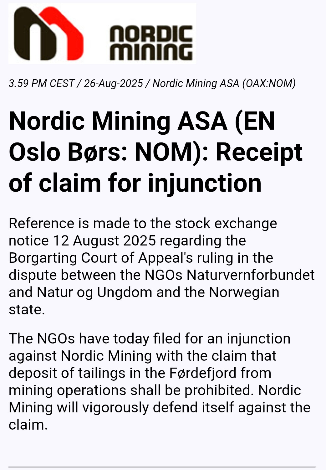 Elokuussa valitustuomioistuin antoi päätöksen kansalaisjärjestöjen hyväksi niiden Norjan valtiota vastaan nostamassa asiassa, jossa kansalaisjärjestöt kyseenalaistivat Engebøn rutiili- ja granaattihankkeen keskeiset luvat. Nordic Mining ei ole osapuolena oikeustapauksessa. Engebøn rutiili- ja granaattihankkeen luvat pysyvät yhtiölle voimassa, ja tuotannon ylösajo etenee suunnitelmien mukaisesti.