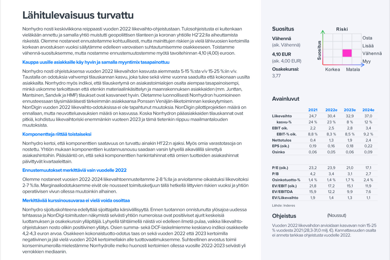 “Norrhydro sijoituskohteena edellyttää sijoittajalta kärsivällisyyttä. Ennen tuotannon onnistunutta ylösajoa uudessa tehtaassa ja NorrDigi-toimitusten näkymistä selvästi yhtiön numeroissa ovat positiiviset ajurit keskeisiä luottamuksen ja osakekurssin ylläpitäjiä. Lyhyellä tähtäimellä näistä voi edelleen ilmetä pulaa, vaikka liikevaihto-ohjeistuksen nosto olikin positiivinen yllätys. Osien summa- sekä DCF-laskelmiemme keskiarvo indikoi osakkeelle 4,2-4,3 euron arvoa. Osakkeen kokonaistuotto-odotus taas on sekä vuoden 2022 että 2023 kertoimilla negatiivinen ja jää vielä vuoden 2024 kertoimellakin alle tuottovaatimuksemme. Suhteellinen arvostus toimii konserninumeroilla mielestämme Norrhydrolle melko huonosti kertoimien ollessa vuosille 2022-2023 selvästi yli verrokkien mediaanin.”