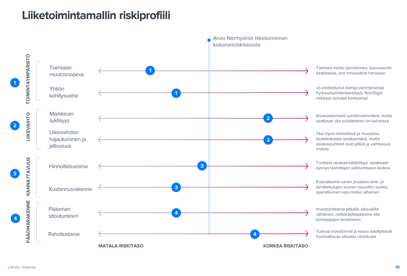 “Koska Norrhydro koostuu kahdesta näkymiltään hyvin erilaisesta liiketoiminnasta (perinteiset hydraulisylinterit ja NorrDigi), arvotamme yhtiötä etupäässä osien summa -mallin mutta lisäksi myös DCF-mallin avulla. Osien summa –mallimme antaa osakkeen arvoksi noin 3,5-3,6 euroa keskiarvon ollessa 3,6 euroa/osake. Osien summasta reilu 80 % kuuluu perinteiselle hydraulisylinteriliiketoiminnalle, joka on helpommin arvotettava. DCF-mallimme indikoi osakkeelle noin 3,6 euron käypää arvoa. Osakkeen tuotto/riskiprofiili on lyhyemmällä aikavälillä epäsuotuisa, sillä tuotto-odotuksen nousu tuottovaatimuksen yli edellyttäisi selvästi odotuksia parempaa tuloskehitystä 2022-2024.”