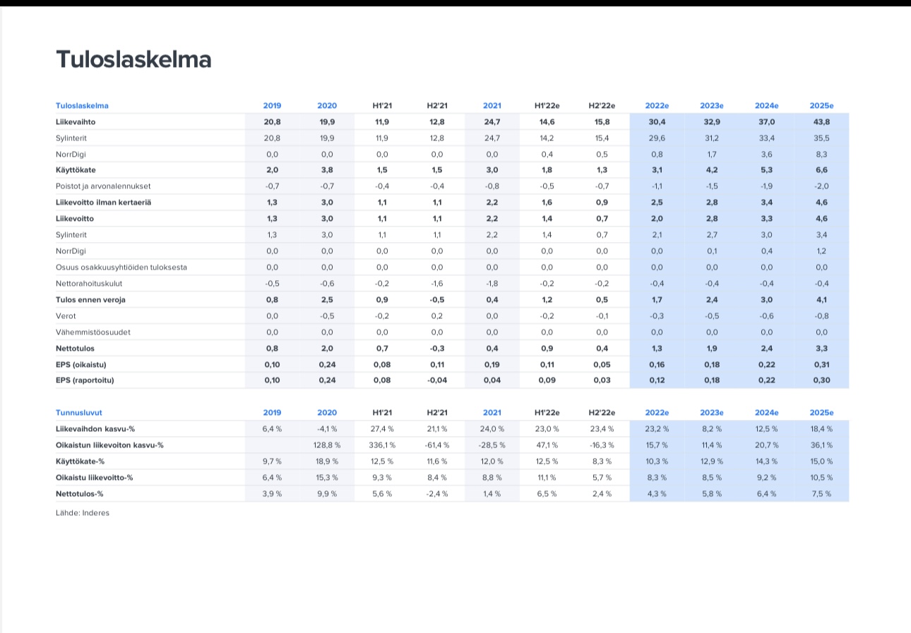 Helpottaisi tässäkin jos sanoisit että missä raportissa tämä 54 meur lv on vuodelle 2026 on mainittu? Vilkaisin vanhoja laajoja raportteja ja ainakin 30.5.2023 julkaistussa laajassa raportissa vuodelle 2026 oli ennustettu 55 meur liikevaihtoa. Jos en väärin muista niin tuohon aikaan sylinterimarkkinan kysyntänäkymät olivat vielä ihan hyvät. Onko sinulla jotain perusteluja tuohon että miksi sen ajan näkymillä tuo liikevaihtoennuste olisi ollut huolimaton? Mielestäni hyvän keskustelukulttuurin ylläpitämiseksi analyysin kritisointia esim. huolimattomuudesta olisi hyvä perustella jollain muullakin kuin mutulla. Erityisesti syklisessä kasvuyhtiössä olisi myös hyvä muistaa että liikevaihtoennusteiden tekeminen monen vuoden päähän on aikalailla arpapeliä, ei analyytikot mitään selvännäkijöitä ole ja sellaisen odottaminen analyytikoilta on mielestäni kohtuutonta. Siksi peräänkuulutan sitä että jos analyysin laatua kommentoidaan niin siihen olisi hyvä olla perusteet ja varsinkin sen ajan näkymillä kun analyysi on tehty.