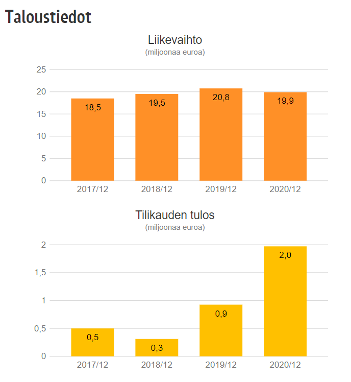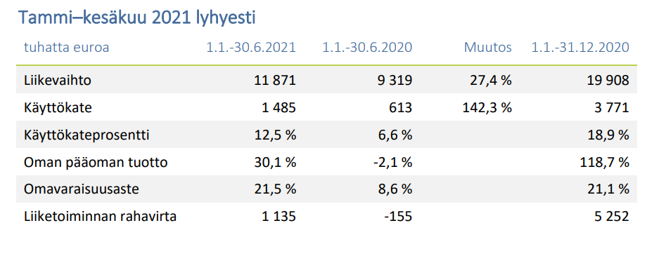 Vuoden 2021 liikevaihtoarvio on 22 500-23 200 tuhatta euroa, joka vastaa noin 13-16 %:n kasvua edelliseen vuoteen verrattuna. Vuoden 2021 käyttökateprosentin arvioidaan olevan 11-12 %, joka on pitkän ajan historiallisen keskiarvon yläpuolella. Raaka-aineiden ja komponenttien hinnannousulla voi olla vaikutusta kannattavuuteen, koska kustannusten nousun siirtäminen asiakashintoihin tapahtuu viiveellä.