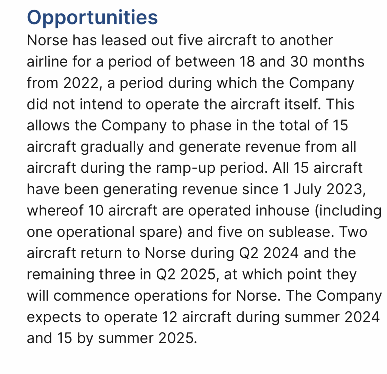 Med draghjälp från en stark sommarmarknad var 23Q3 Norses första lönsamma kvartal, och 2024 förutspås bli det första lönsamma helåret. Den nordatlantiska flygmarknaden är säsongsbetonad, och som motvikt till sommarens höga passagerarantal är vintern en överlevnadskamp där ett nollresultat är en utmärkt prestation. Detta kräver betydande skicklighet från ledningen när det gäller att omdirigera flygplan till rutter söderut och förbrukar enormt mycket rörelsekapital, eftersom hela året måste planeras med vintersäsongen i åtanke.