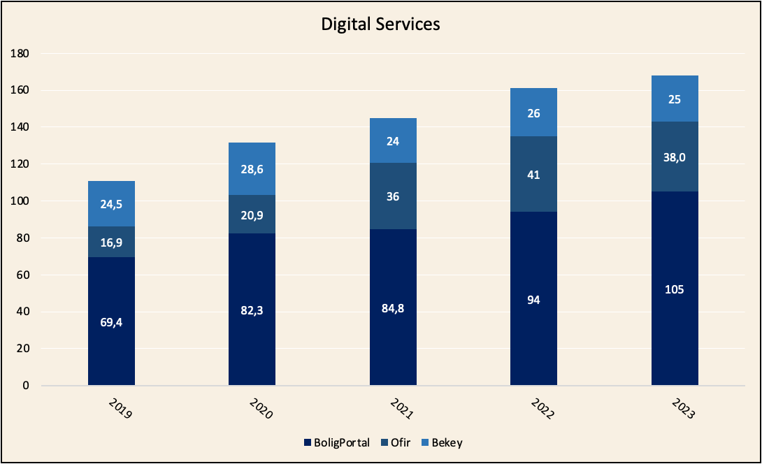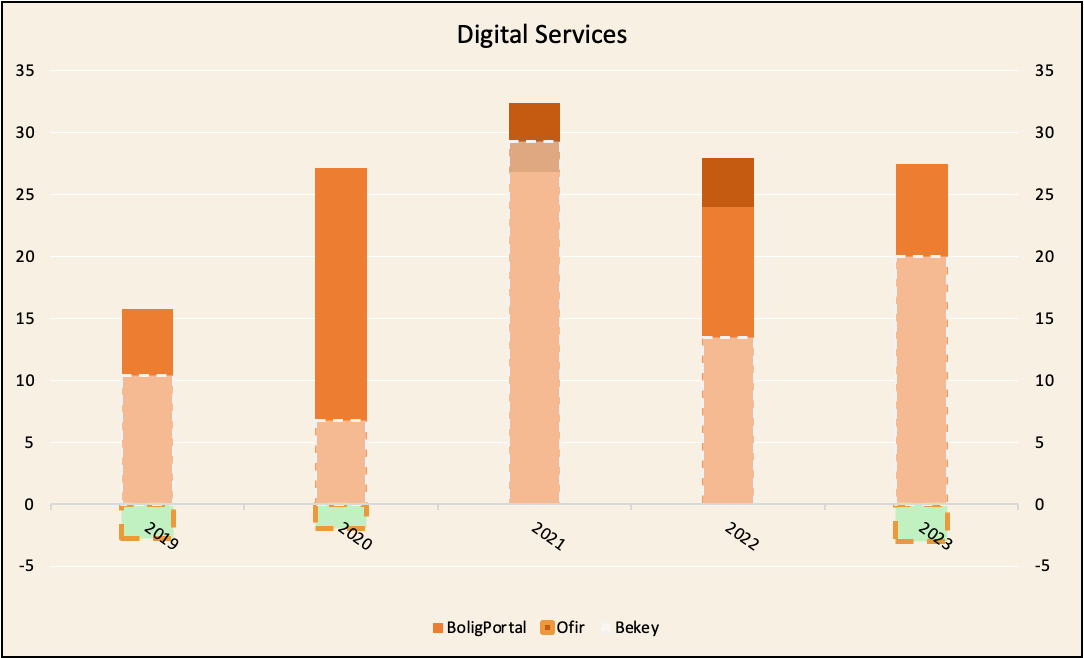 Tämä toinen liiketoimintayksikkö koostuu kolmesta eri liiketoiminnasta: BoligPortal, Ofir ja Bekey. Käytännössä nämä ovat yhtiön tulevaisuus, koska tuohon mainoksien jakoon liittyy riski koko liiketoiminnan kieltämiseen johtuen siitä, että paperin printtaaminen ja sitten jakaminen käytännössä kotitalouksien roskapönttöön ei ole ESG tai kovinkaan modernia ![]()