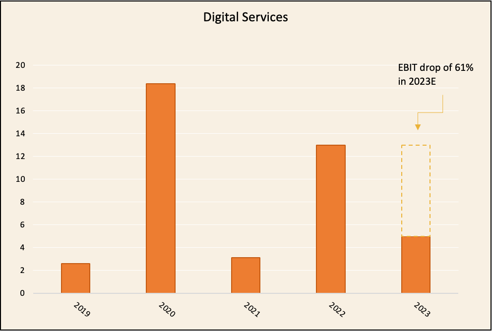 Tuossa oli nyt todella karkeasti mitä yhtiö tekee. Historiaa “Digital Services” osastolta vain vuodesta 2019, koska vasta vuonna 2020 tehtiin tämä nykyinen malli, jossa business on jaettu näihin kahteen alueeseen.