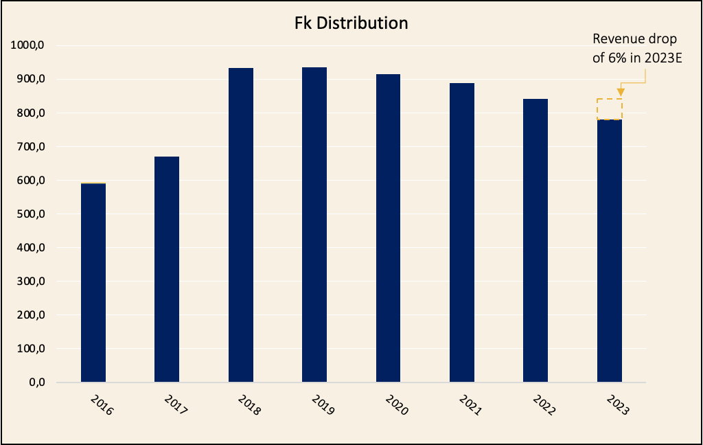 Tämä on ollut hauska löytö, kun tosiaan on poikkeuksellisen paljon tuota rahaa taseessa. Suuri vaikuttaja yhtiön arvoon on se, että kuinka monta vuotta saadaan kassavirtaa Fk Distributionin liiketoiminnasta. En osaa itse oikeastaan sanoa siihen mitään, mutta uskoisin, että kassavirtaa saadaan kauemmin, mitä osakkeeseen on hinnoiteltu