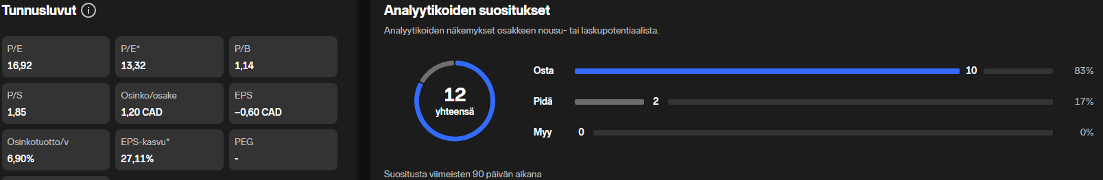 Q4 ja 2024 luvut tuli julki viime yönä, puhelu on vasta tänään. Odotuksiin meni Q4 kuitenkin ja kolme suurprojektia etenee budjetissa ja ajallaan. Eiköhän kurssi palaudu jollain aikavälillä ja johan tuo nousi 17 → 19 ennen osaria. Osinko pysyy 1,20 cadissa / osake (noin 6% juuri tällä hetkellä).