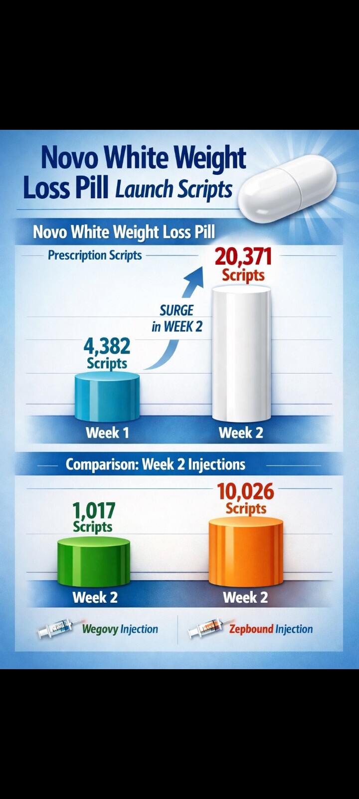 “TRx betyder det samlede antal recepter/personer, der har bestilt Wegovy-pillen. MEN de data, vi ser i disse uger, er KUN det fysiske salg fra apoteker og forsikringsselskaber. Det inkluderer ikke data for al den telehealth, hvor forbrugeren vælger at få Wegovy-pillen sendt til sin adresse.