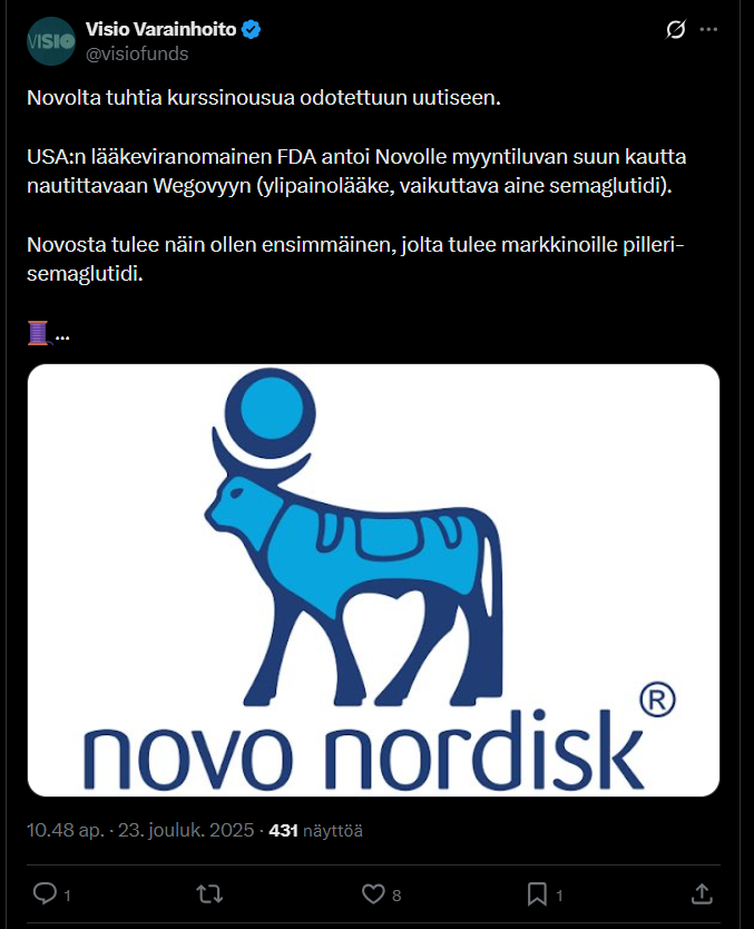 Novo Nordisk, Tanskan Nokia ja mitä näitä kaikkea on nyt ollut. Viikko toisensa jälkeen ihmetyttää nämä markkinareaktiot ties mihin uutisiin. Tällä kertaa täysin odotettuun myyntilupaan sitten noustiin +10 %