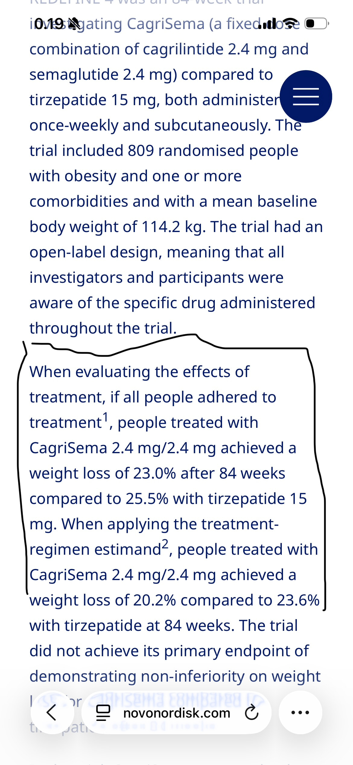 Redefine-4 ensisijainen päätetapahtuma oli ” non-inferiority” painonpudotuksessa 84 viikon kohdalla tirzepatidia vastaan. Päätetapahtumaa ei saavutettu, eli jäi todistamatta että CS on ”ei-huonompi” tirzeä vastaan, eli voimaan jää oletus: on huonompi.