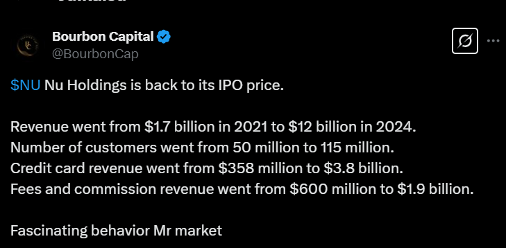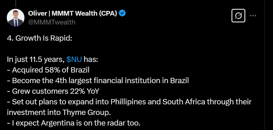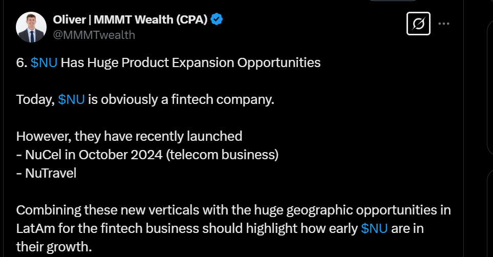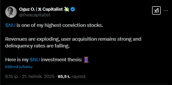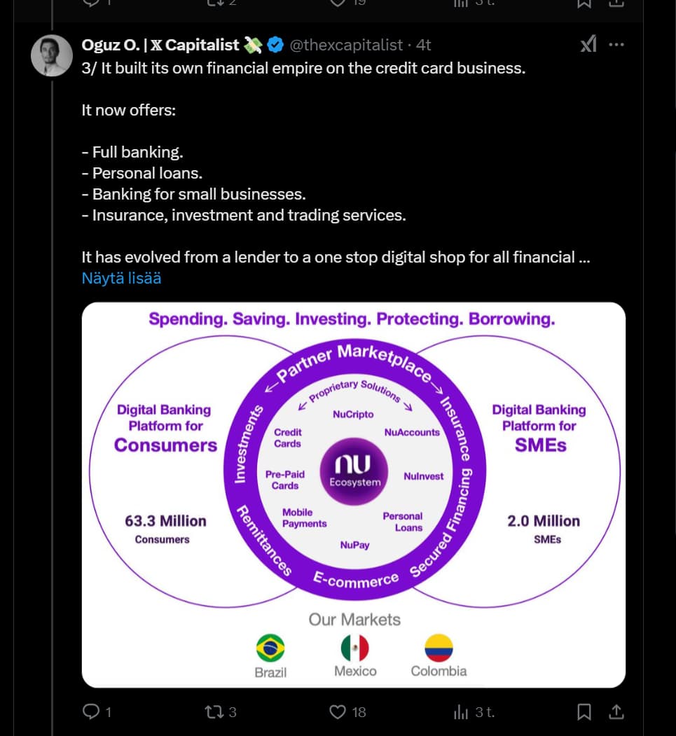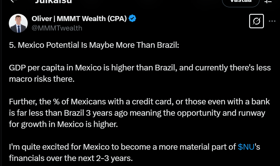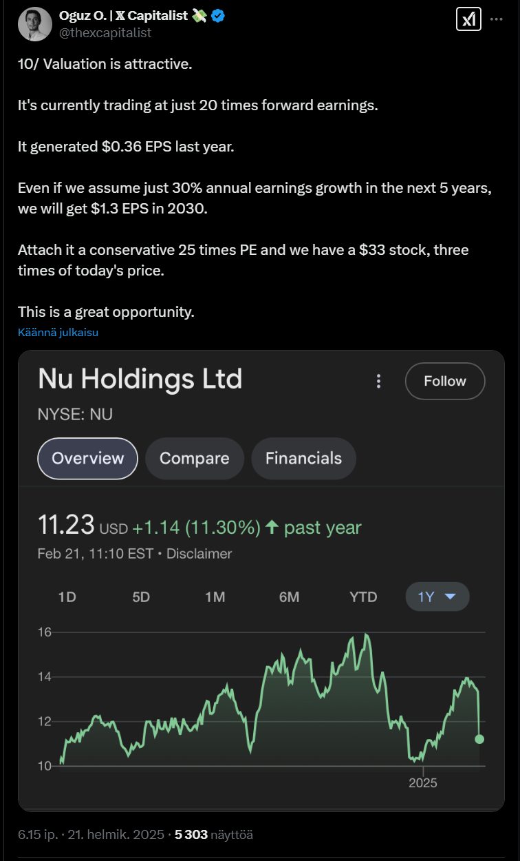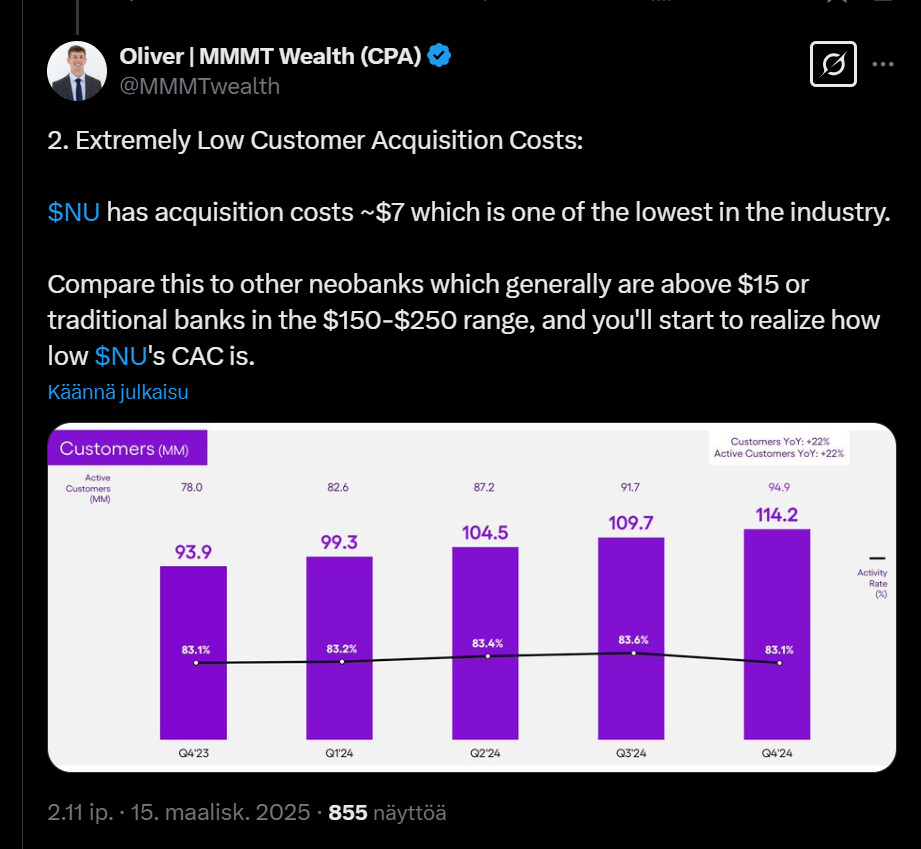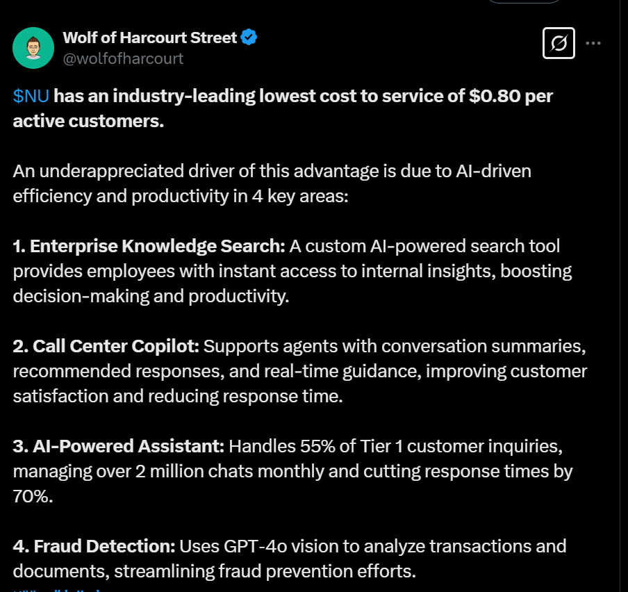 Tässä on nostettu Nu Holdingista muutamia seikkoja ylös. Tviitissä korostetaan sillä olevan hyvin alhaiset kulut per asiakas, joka onnistunut ilmeisesti aika paljolti tekoälyn avulla.
