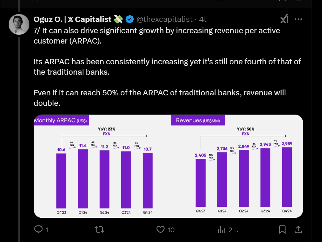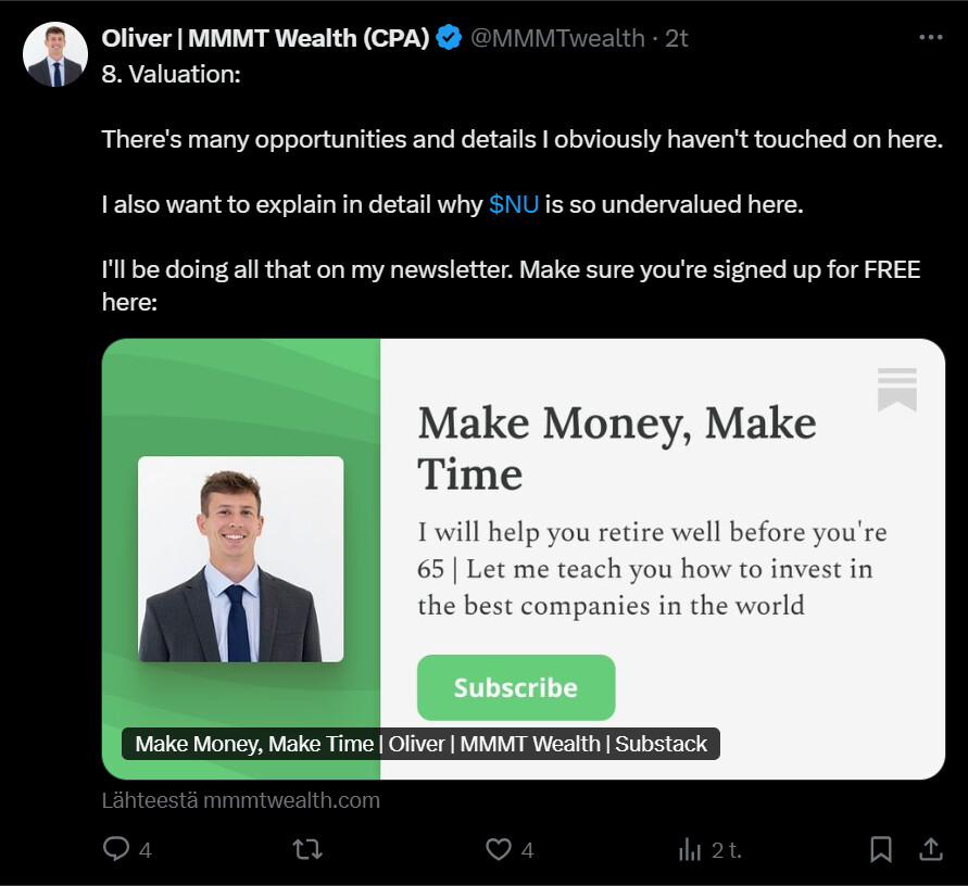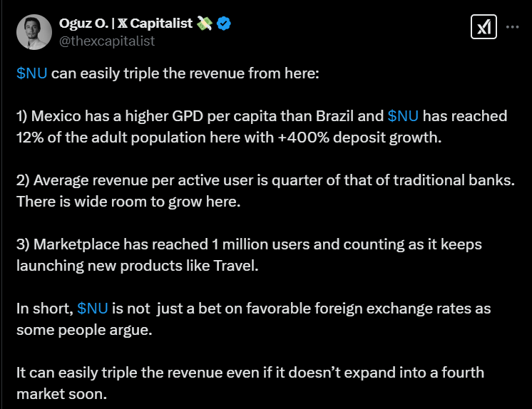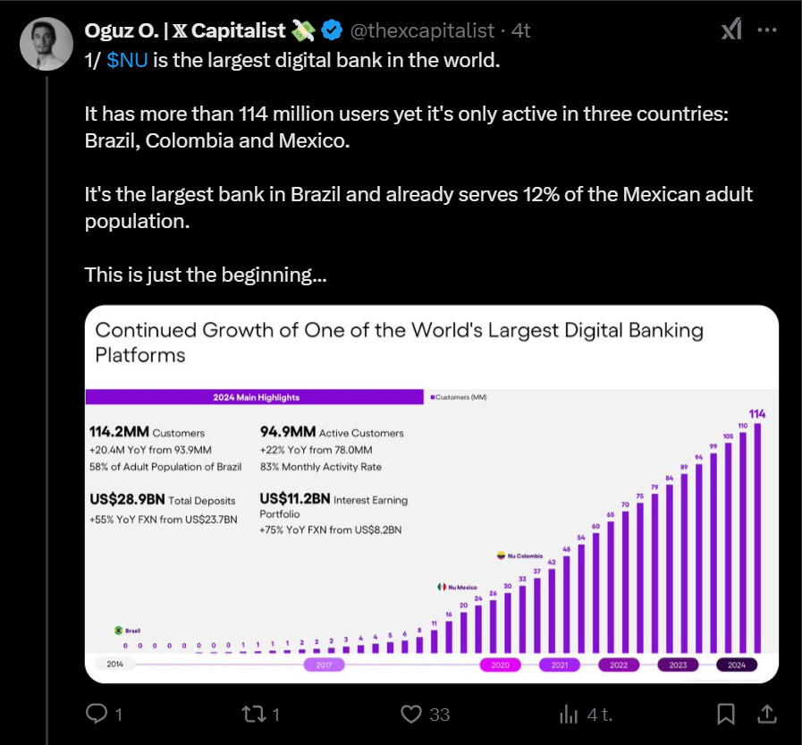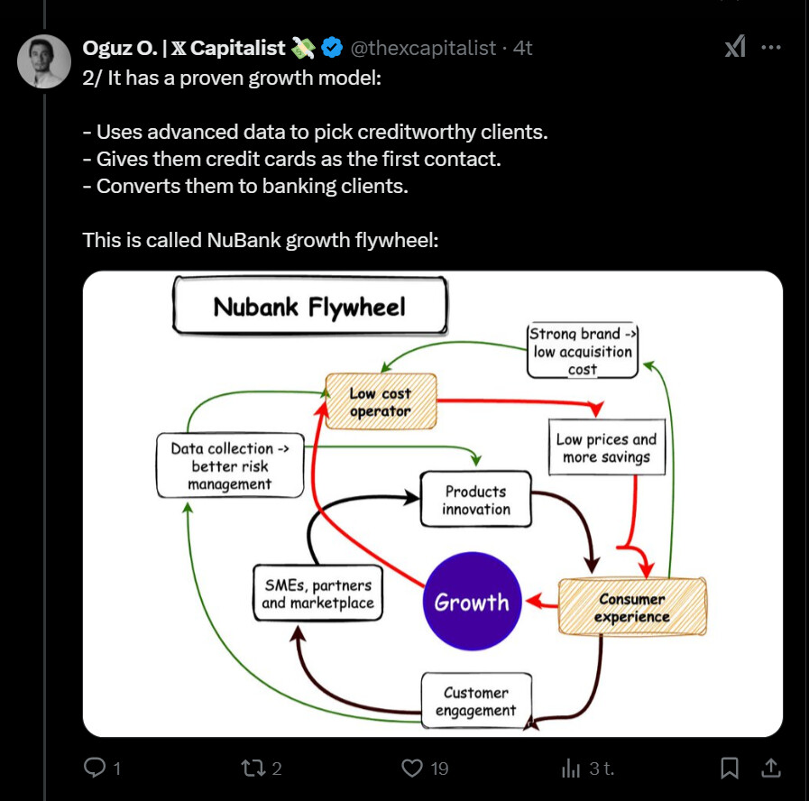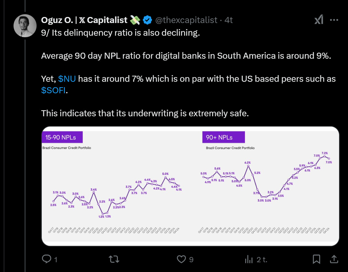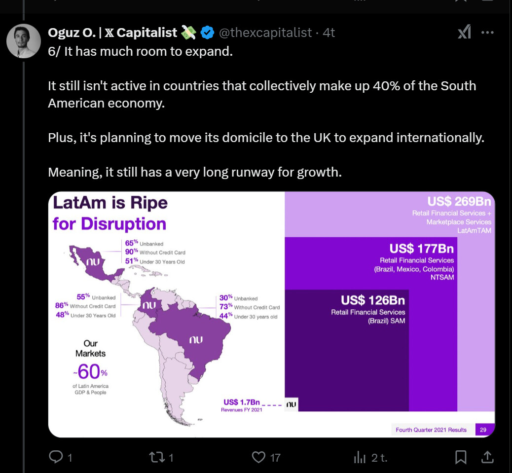 Tässä on nostettu Nu Holdingista muutamia seikkoja ylös. Tviitissä korostetaan sillä olevan hyvin alhaiset kulut per asiakas, joka onnistunut ilmeisesti aika paljolti tekoälyn avulla.