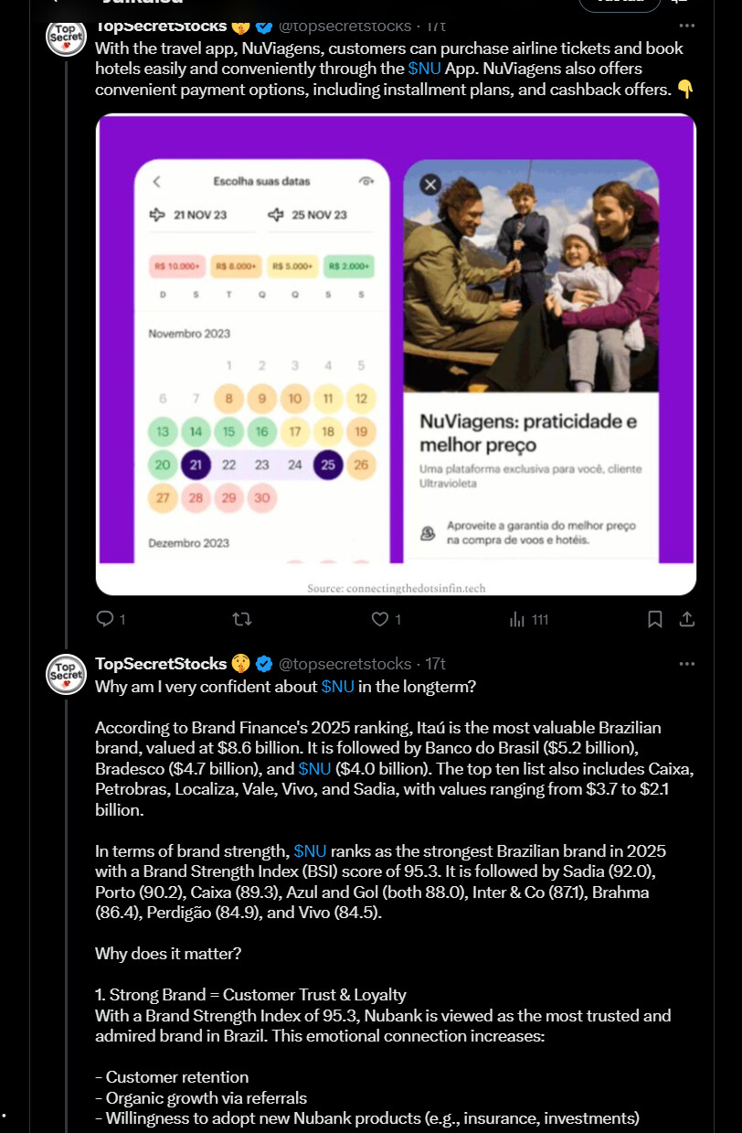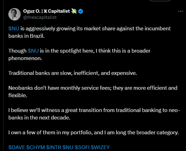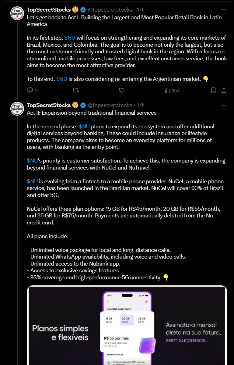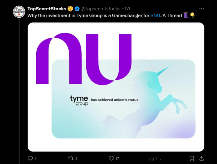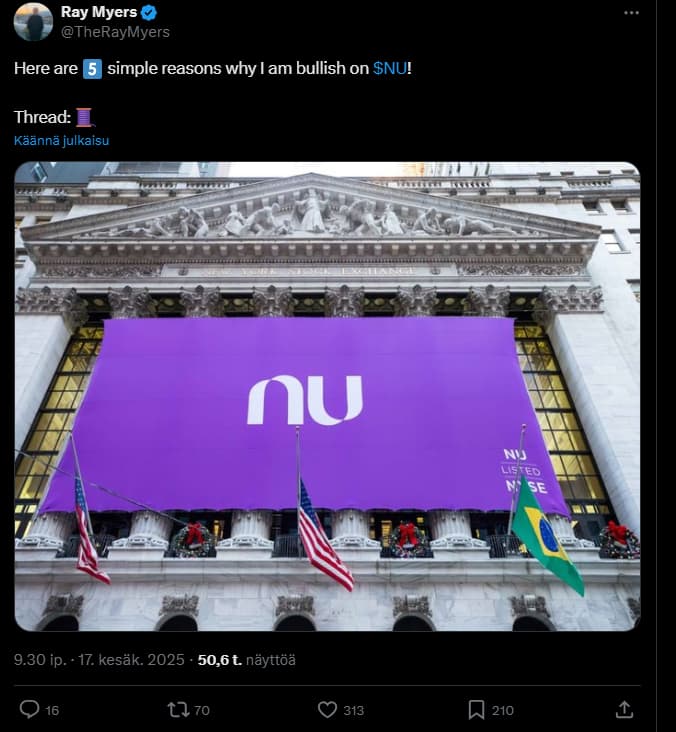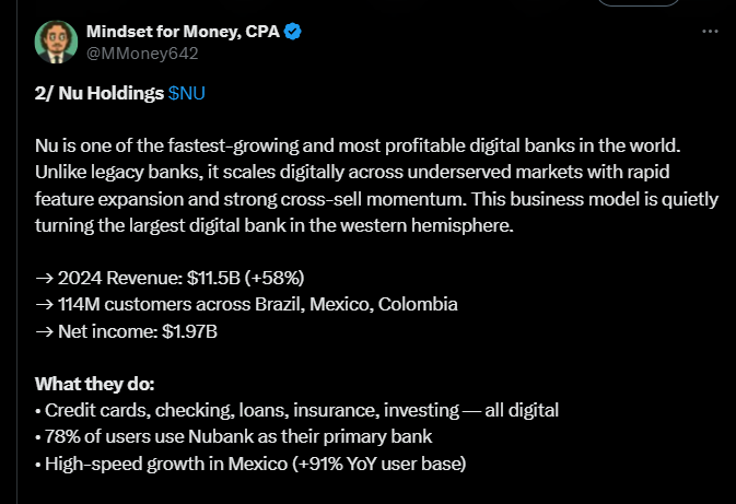 Tässä on monipäkkeriteemaisesta ketjusta bongattu Nu Holdingsin osuus. Siinä ilmaistaan, miten Nu Holdings kasvaa nopeasti ja kannattavasti.
