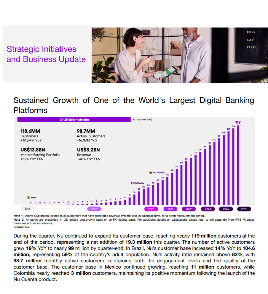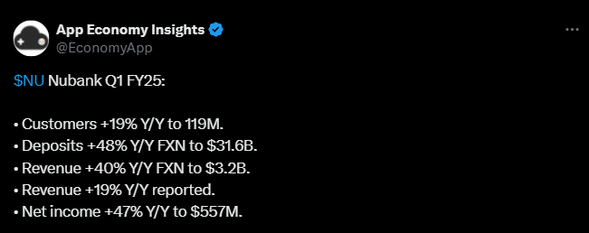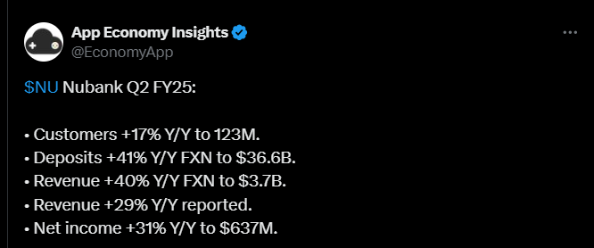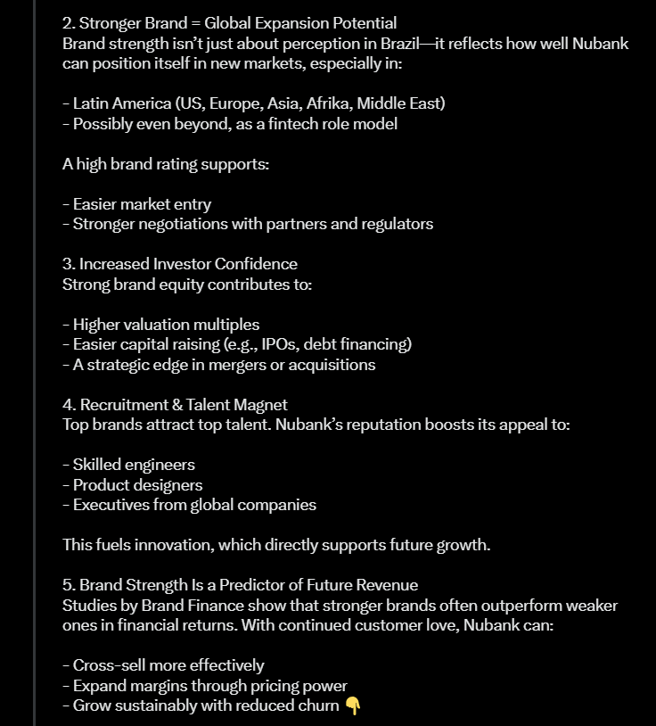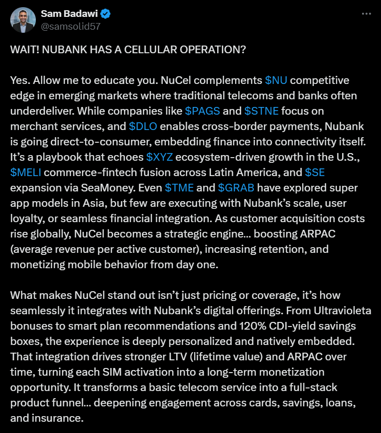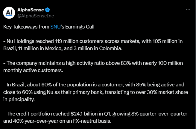 Alla on tviitti, jossa kerrotaan tulospuhelusta ja siinä nostettiin mm. tällaisia asioita, kuten miten Nu Holdings korosti tulospuhelussa vahvaa asiakasaktiivisuutta ja syveneviä asiakassuhteita erityisesti Brasiliassa, jossa suuri osa käyttää yhtiötä pääasiallisena pankkinaan.