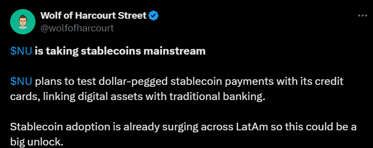 Alla olevassa tviitissä kerrotaan siitä, miten Nuuuuu aikoo testata dollaripohjaisia stablecoin-maksuja luottokorteilla Latinalaisessa Amerikassa, yhdistäen kryptohommat ja perinteisen pankkitoiminnan.