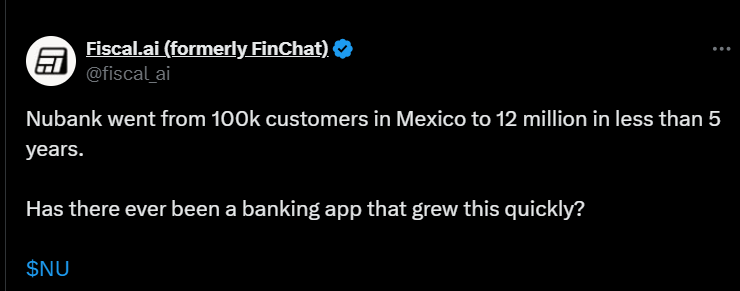 Tässä on tviitti Nu Holdingisin meksikon asiakasmäärien kasvusta.