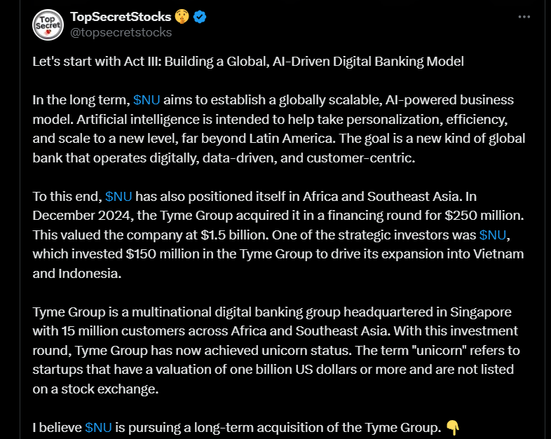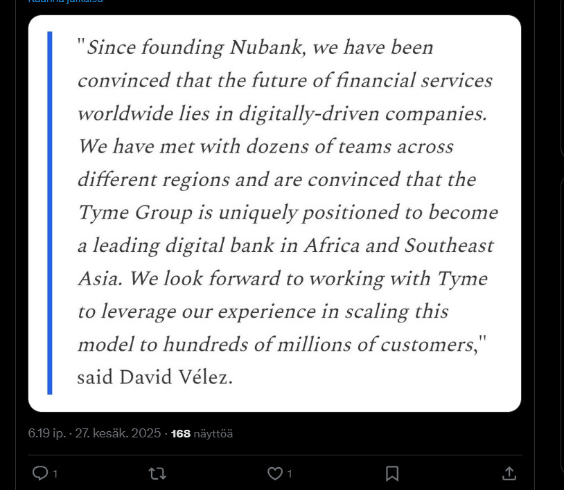 Alla olevassa tviittiketjussa käydään, vaikka mitä läpi, mutta mm. sitä, miten yhtiö etenee kolmiportaisella strategialla: ensin se vahvistaa asemaansa Latinalaisessa Amerikassa, sitten laajentaa palveluitaan erilaisiin digitaalisiin ekosysteemeihin ja lopulta tähtää globaaliksi tekoälypohjaiseksi pankkitoimijaksi. Tyme Group -investointi tukee tätä kehitystä.