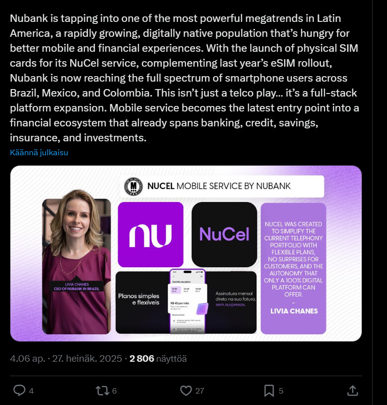 Nubankin oma mobiilioperaattori NuCel vahvistaa entisestään yhtiön asemaa Latinalaisen Amerikan markkinoilla, missä pankki- ja telepalvelut usein ns. pettävät ja ovat ongelmallisia.