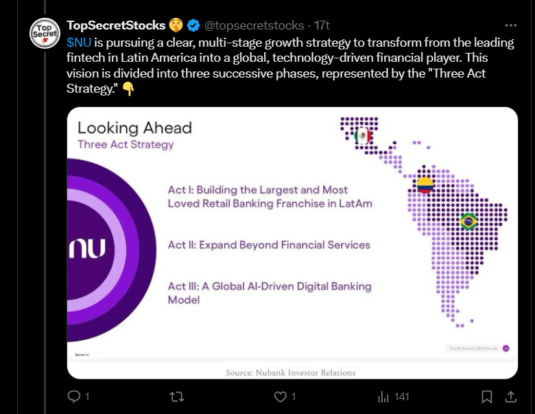 Tviitissä muistutetaan, miten se tarjoaa kattavat pankkipalvelut täysin digitaalisesti, palvellen erityisesti alipalveltua väestöä Brasiliassa, Meksikossa ja Kolumbiassa. Asiakkaat käyttävät Nubankia ensisijaisena pankkinaan ja palveluiden laajentaminen kasvattaa asiakaskohtaistakin tuottoa. Alhaiset hankintakustannukset, edullinen talletuspohjainen rahoitus ja korkea ristiinmyyntiaste tukevat yhtiön mahdollisuuksia kaksinkertaistaa liikevaihtonsa lähivuosina.