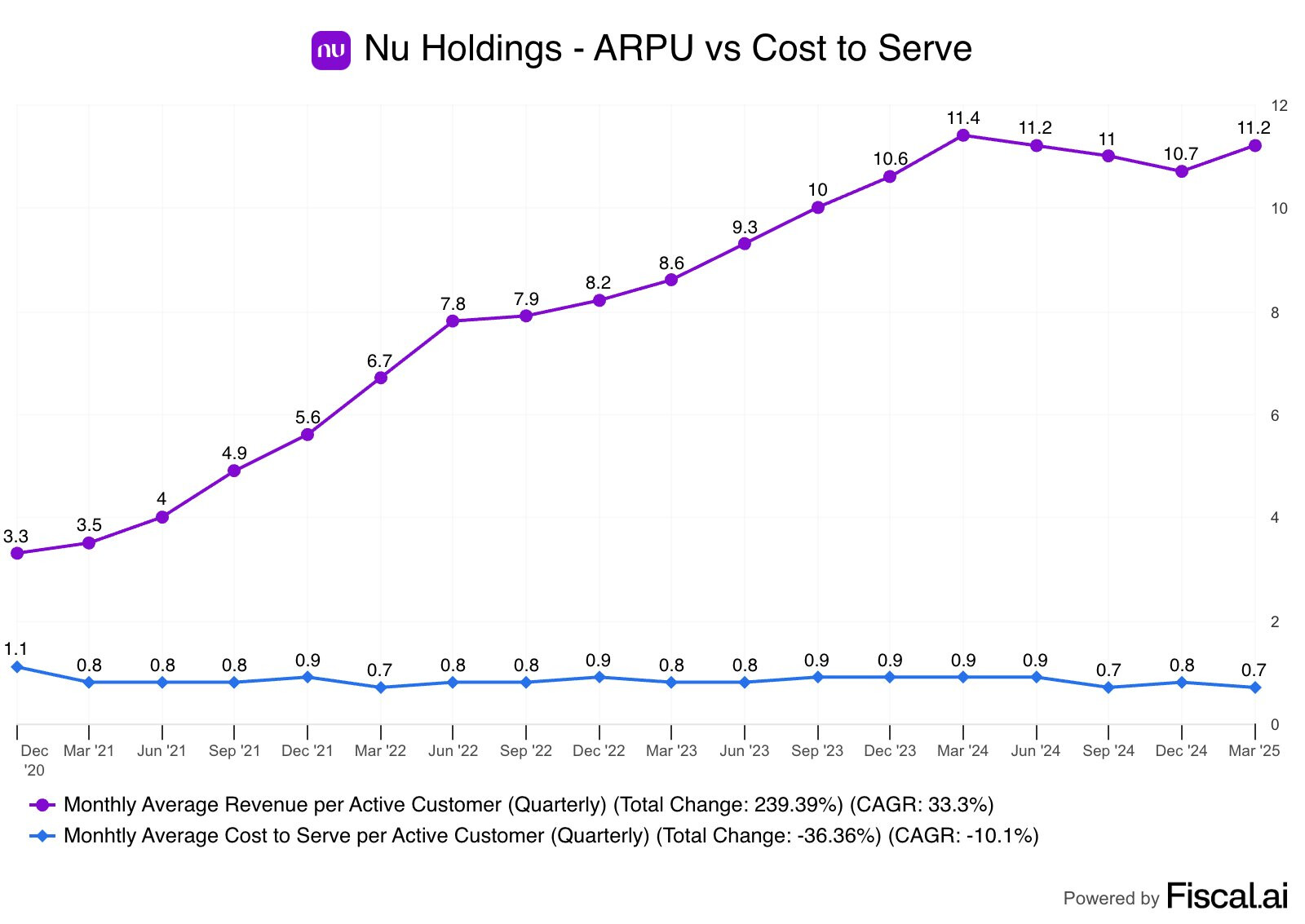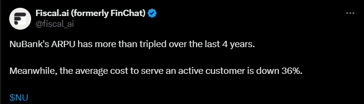 Asiakaspalvelun kustannukset ovat ajan myötä laskeneet ja luottotappiot samalla pienentyneet. Tviitin pääsanoma on, että Nu yhdistää kannattavuuden ja kasvun poikkeuksellisen hyvin.