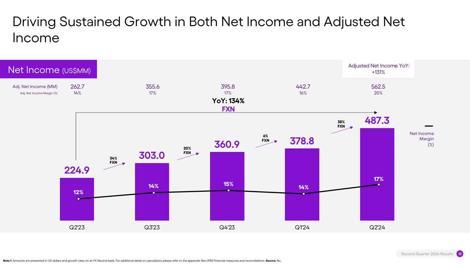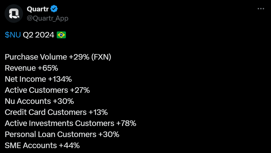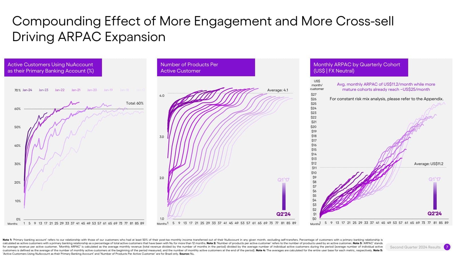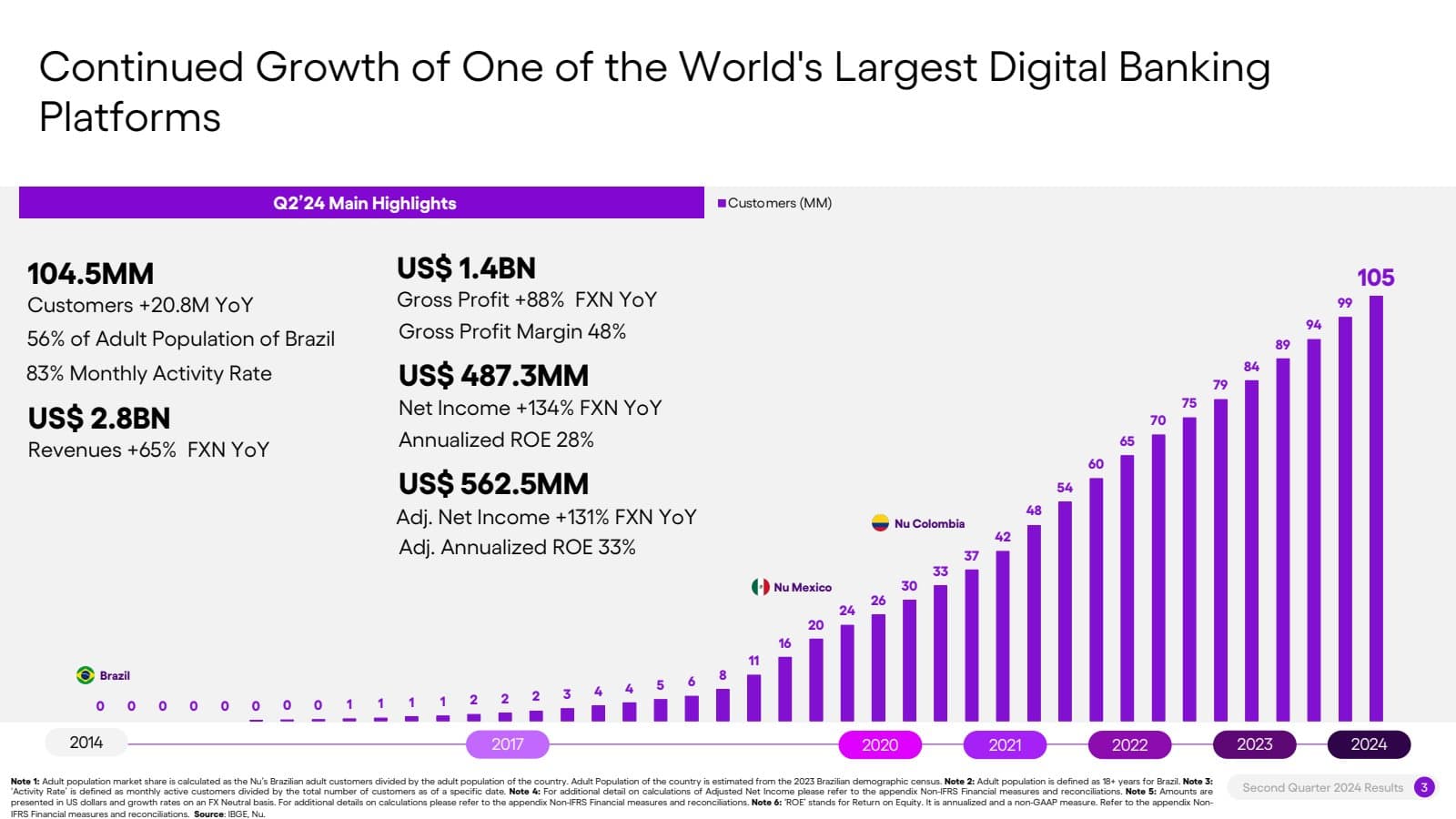 Yhtiö panosti asiakkaiden aktiivisuuteen ja palveluiden laajentamiseen, mikä näkyi kasvavina keskimääräisinä kuukausituloina per asiakas. Korkotuottoja kerryttävä salkku ja talletukset kasvoivat, mikä lisää yhtiön vakaata taloudellista asemaa. Nubankin laajentuminen Meksikoon ja Kolumbiaan on sujunut odotettua paremmin, lisäksi tavoitteena on vakiinnuttaa asema maailman johtavana digitaalisena palvelualustana.
