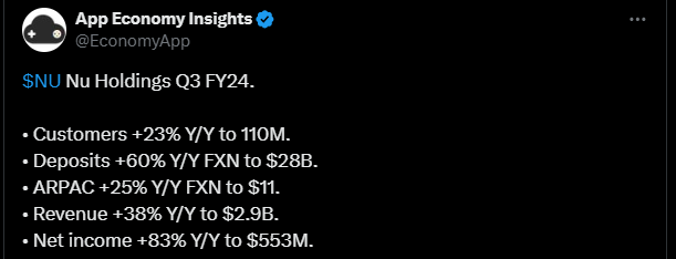 Nu Holding teki vahvaa tulosta kolmannella vuosineljänneksellä, kun liikevaihto ja voitto kasvoivat merkittävästi. Asiakasmäärä kasvoi ja uusia asiakkaita tuli lähes 5,2 miljoonaa, jolloin kokonaisasiakasmäärä on jo yli 109 miljoonaa.