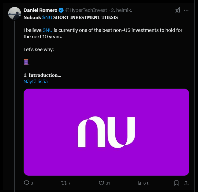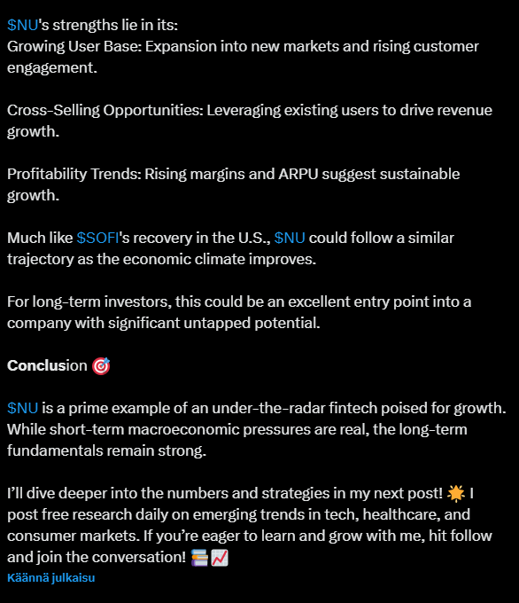 Tviittaja pitää NU:ta kiinnostavalta, koska 21x P/E-luvulla saa vahvaa kasvua asiakasmäärissä, tuloissa ja voitossa, lisäksi tviitissä korostetaan monipuolista tuoteportfoliota ja suurta kansainvälista laajentumismahdollisuutta erityisesti Latinalaisessa Amerikassa.