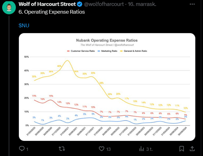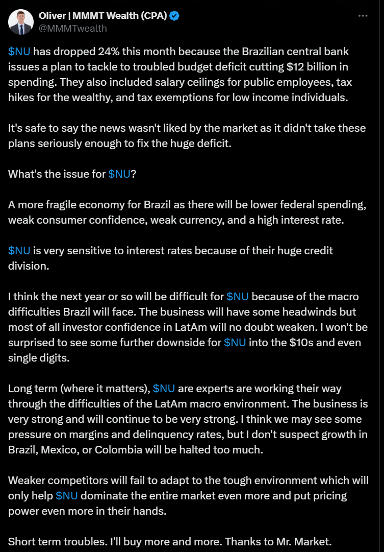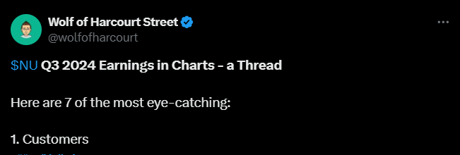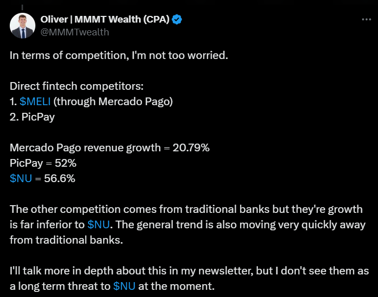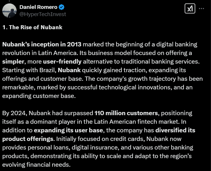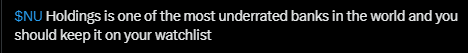 NU Holdings on aliarvostettu osake monien mukaan, kuten tästäkin ketjusta voi huomata. Yhtiö on onnistunut alustallaan saamaan alhaiset kulut ja edulliset palvelut asiakkaille esim. latinalaisen Amerikan pankit perivät yleensä korkeita maksuja, mutta NU erottuu edullisuudellaan.