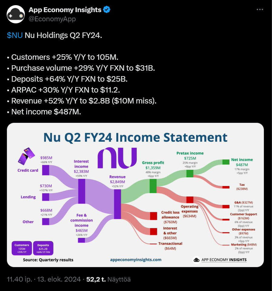 NUulla on yli 110 miljoonaa asiakasta, jotka pääosin ovat Brasiliasta ja potentiaalia merkittävään kasvuun löytyy lisää samasta maanosasta. $MELI eli Mercado Libre (ketju löytyy Foorumilta) tukee NU:ta maksupalveluissa ja luottoratkaisuissa vakiinnuttaen asemansa alueen markkinoilla.