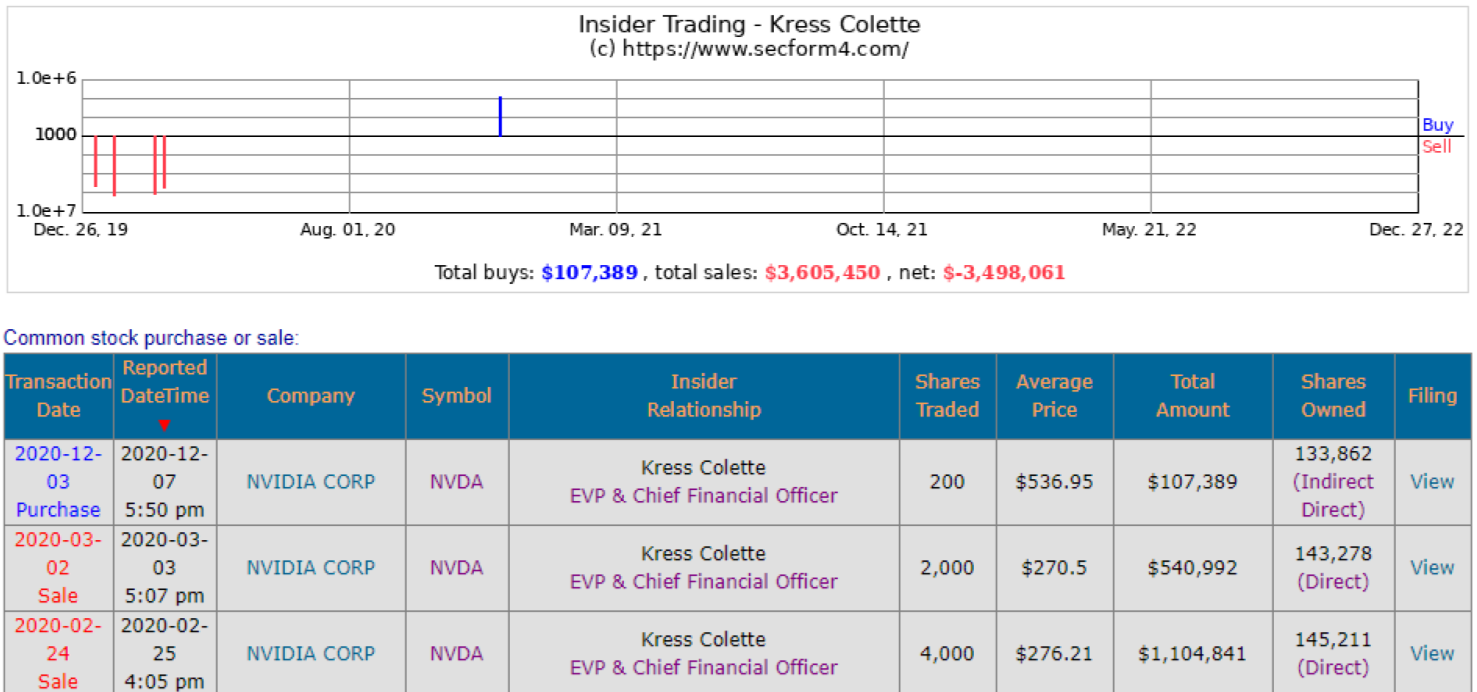 Jag blev intresserad av Jen-Hsuns och Colette Kress aktieförsäljningar under de senaste 3 åren. Jen-Hsuns iver att sälja har avtagit efter förra mars, och Colette har inte sålt något på 2,5 år. Sett med positiva glasögon tror NVIDIAs toppduo starkt på sitt bolag.
